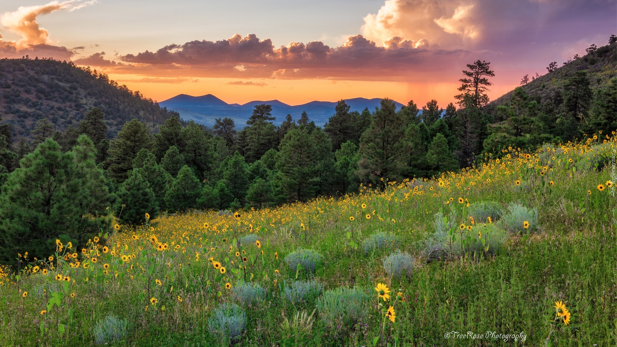 Edytor tapety: Kwiaty na leśnej polanie na tle gór
