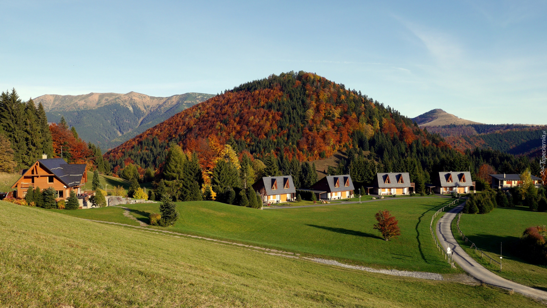 Edytor tapety: Domy pod zalesioną jesiennymi drzewami górą