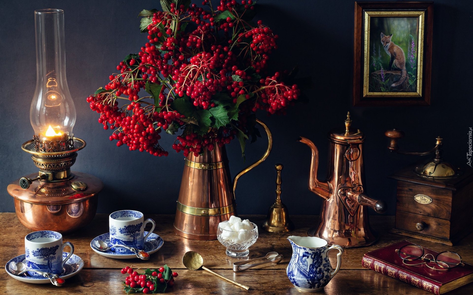 Edytor tapety: Kalina w dzbanku obok lampy