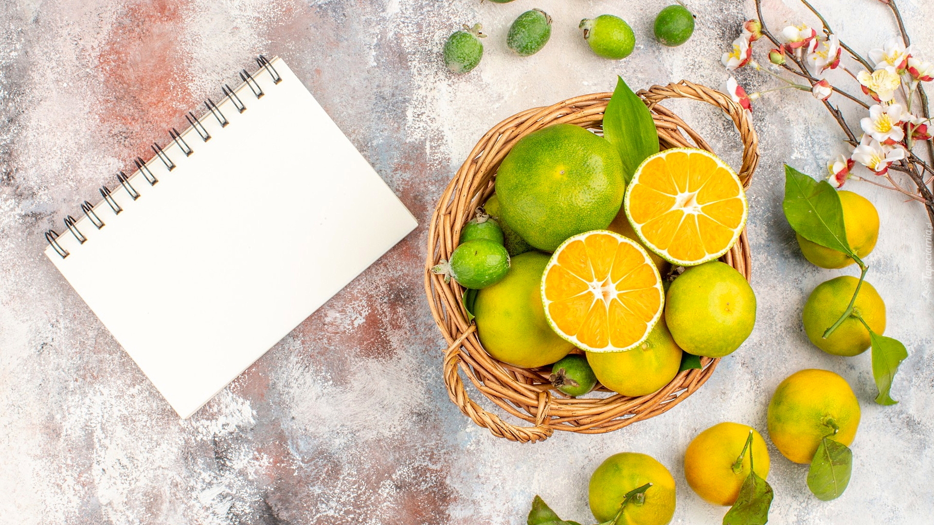Edytor tapety: Cytrusy w koszyku obok notesu