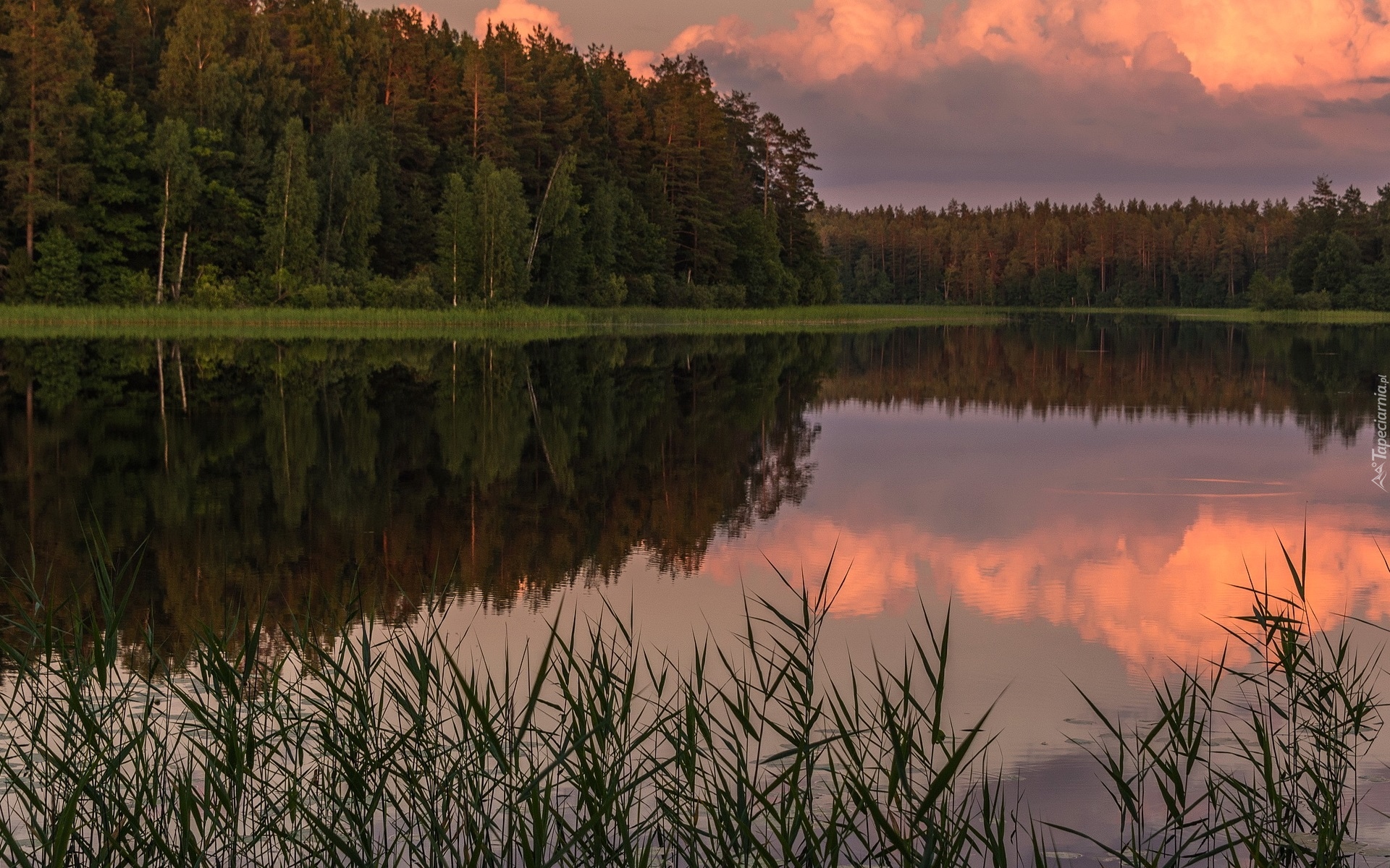 Edytor tapety: Szuwary i las nad jeziorem