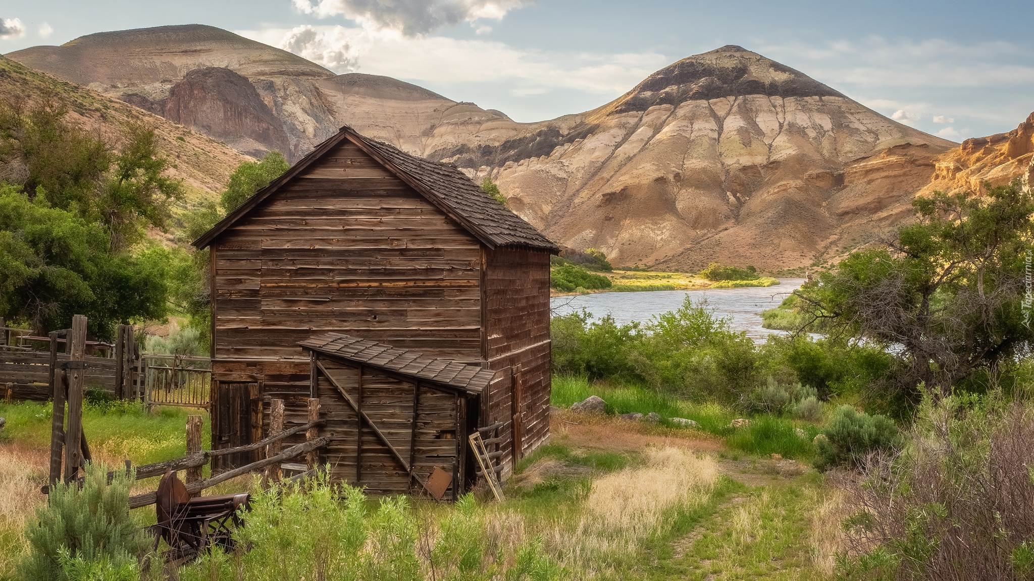 Edytor tapety: Drewniana szopa na tle gór