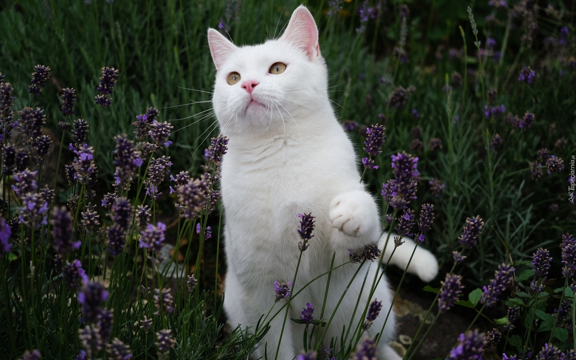 Edytor tapety: Biały kotek w kwiatach lawendy