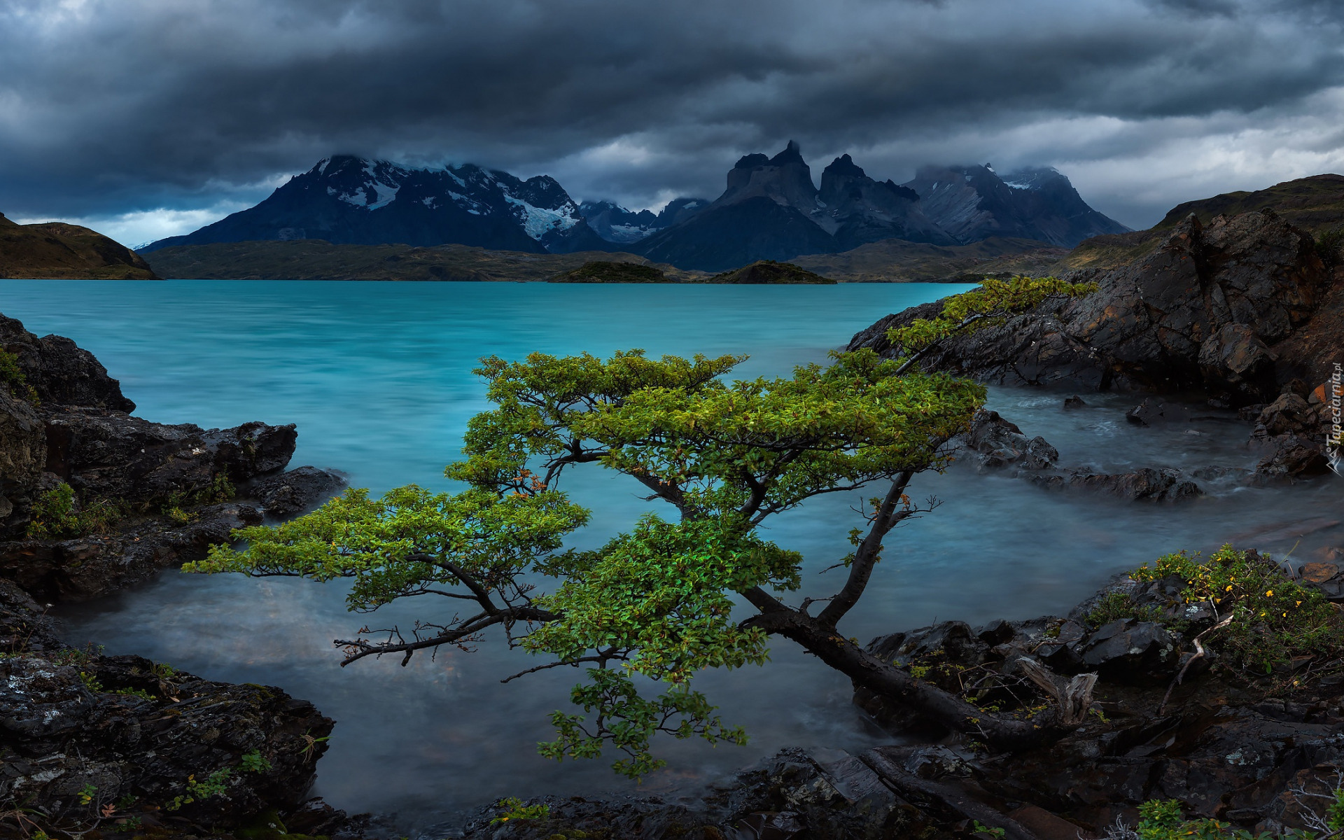 Edytor tapety: Ciemne chmury nad jeziorem Lake Pehoe w Andach
