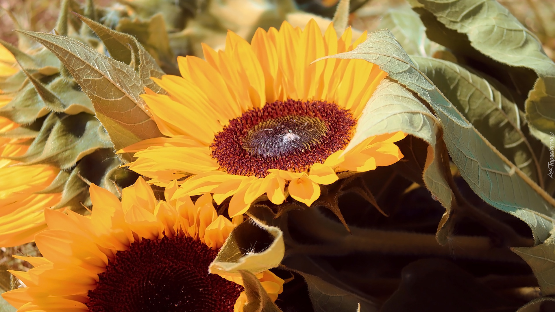 Edytor tapety: Dwa rozświetlone słoneczniki z liśćmi