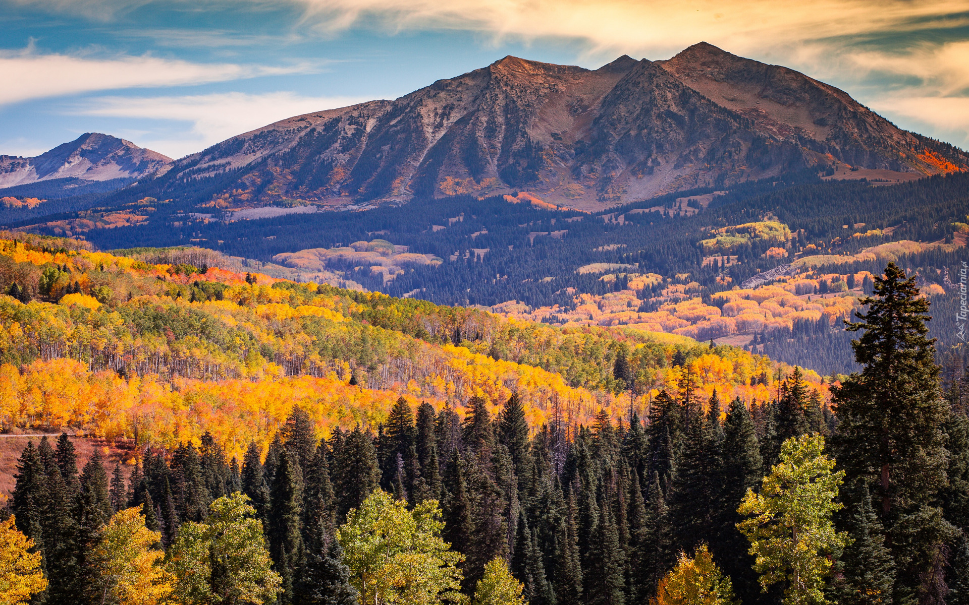 Edytor tapety: Pożółkłe drzewa w lesie na tle góry