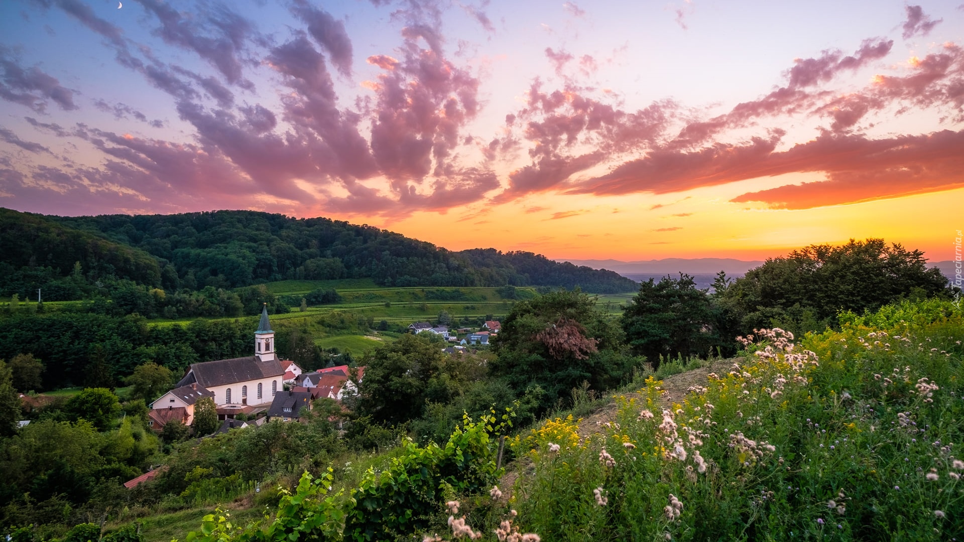 Edytor tapety: Widok ze wzgórza Kaiserstuhl na kościół