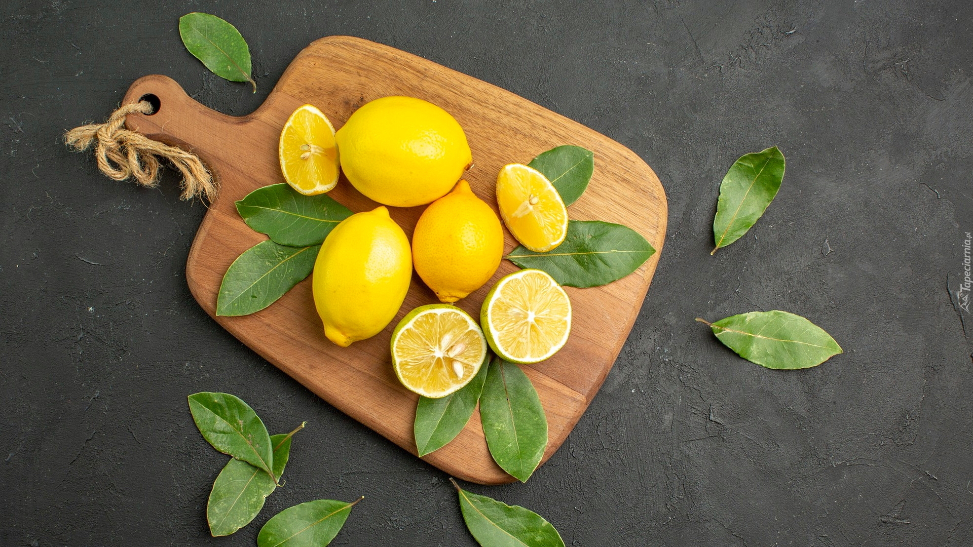 Edytor tapety: Cytryny i liście na desce