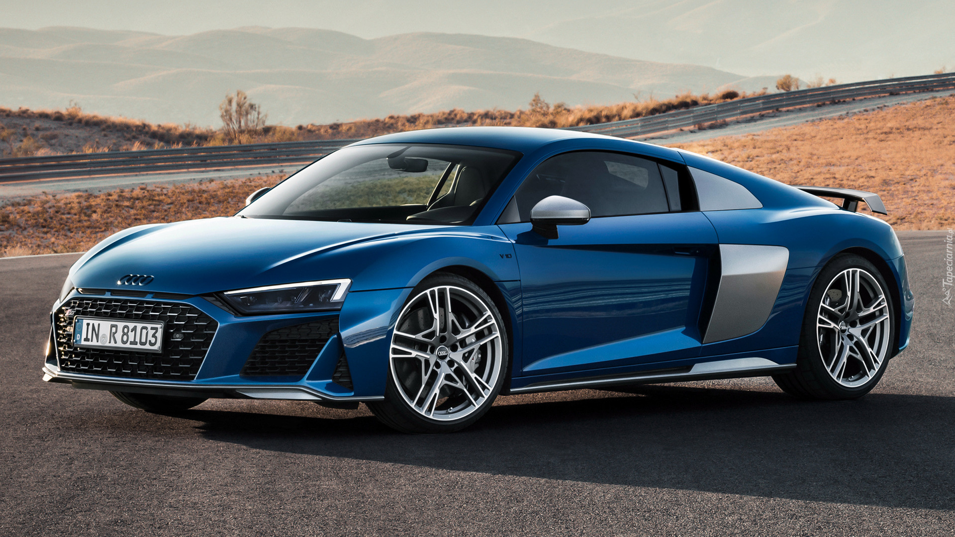 Edytor tapety: Niebieskie Audi R8 Coupe Performance bokiem