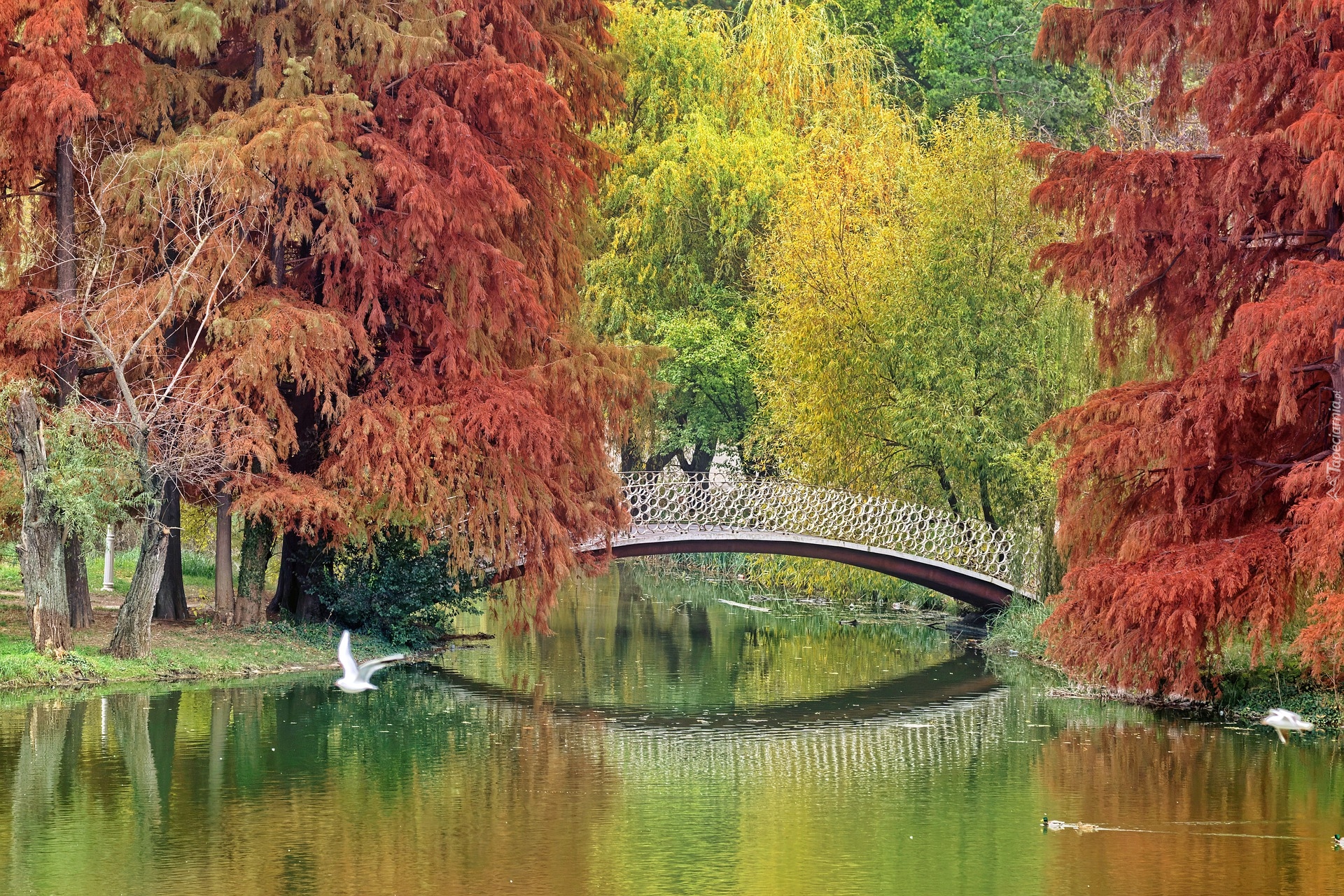 Edytor tapety: Jesienne drzewa przy mostku nad jeziorem w parku