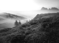 Edytor tapety: Kwiaty na wzgórzu na tle zamglonych o poranku gór