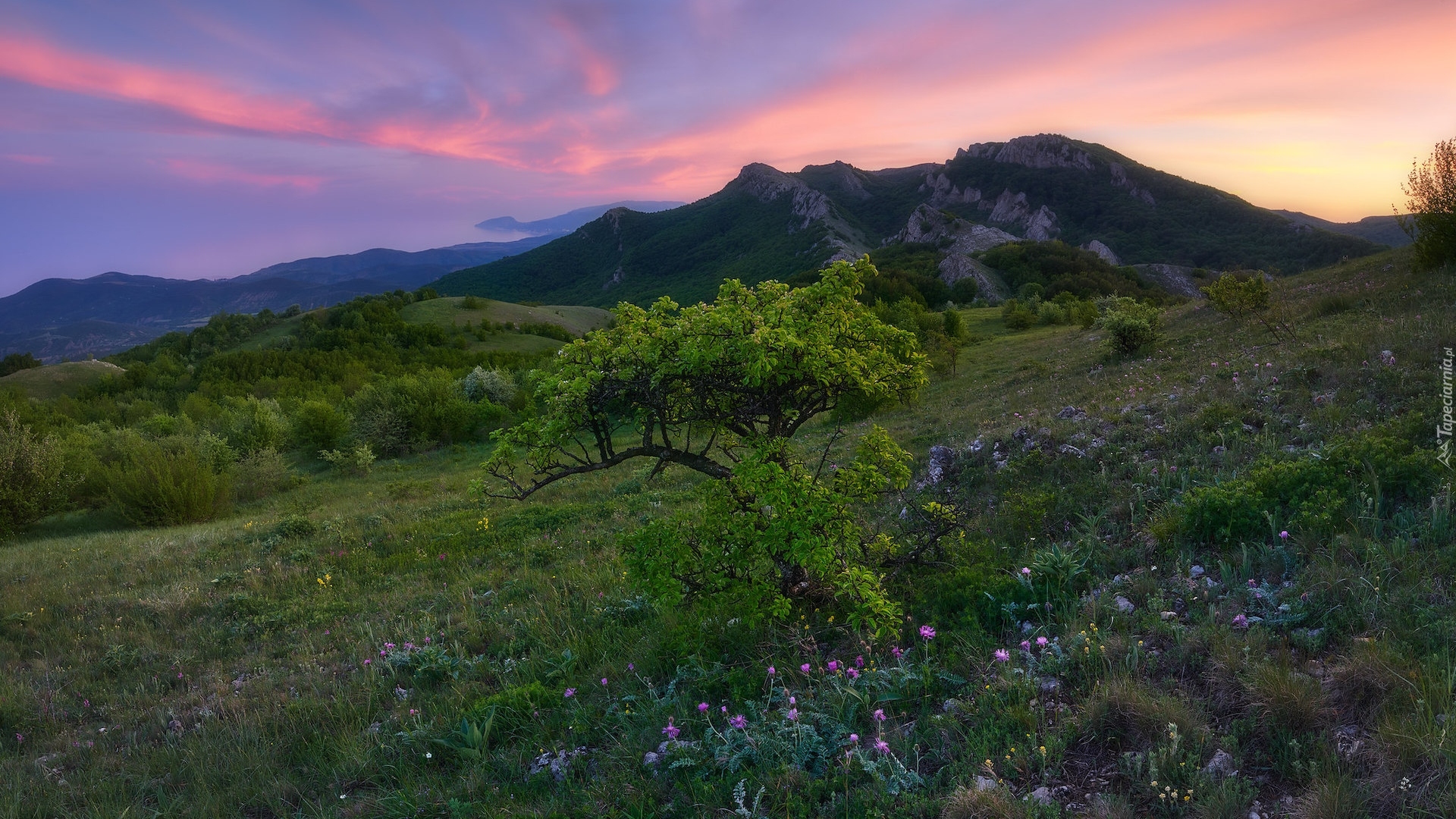 Edytor tapety: Kwiaty i drzewa na wzgórzu na tle gór