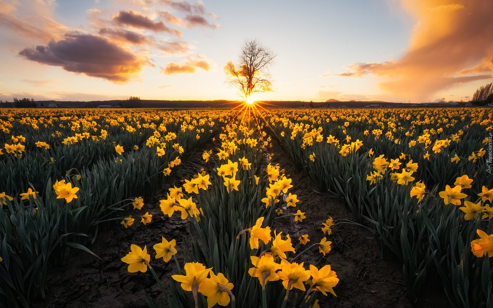 Edytor tapety: Plantacja żonkili w blasku zachodzącego słońca