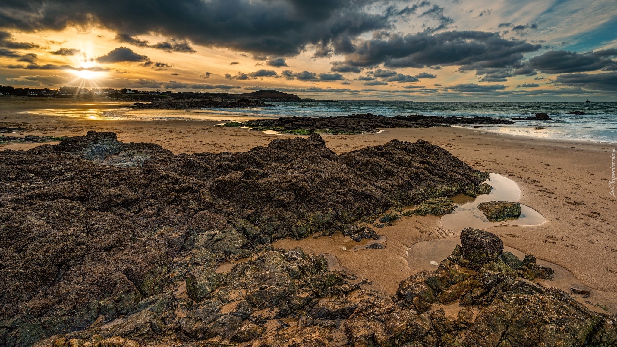 Edytor tapety: Skały nad brzegiem morza w promieniach słońca
