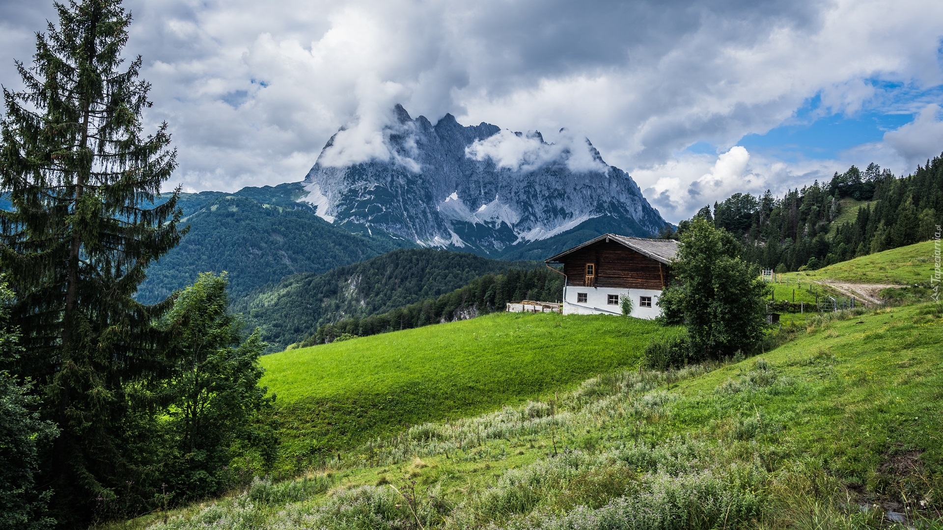 Edytor tapety: Domek na tle zamglonych gór