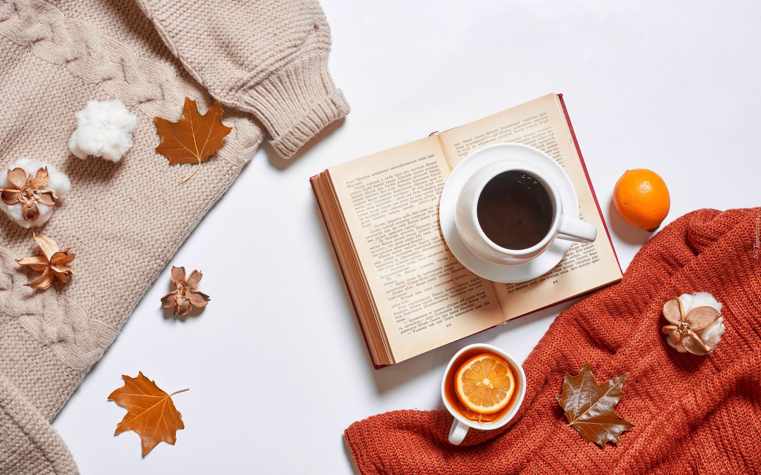 Edytor tapety: Swetry obok filiżanki kawy na otwartej książce