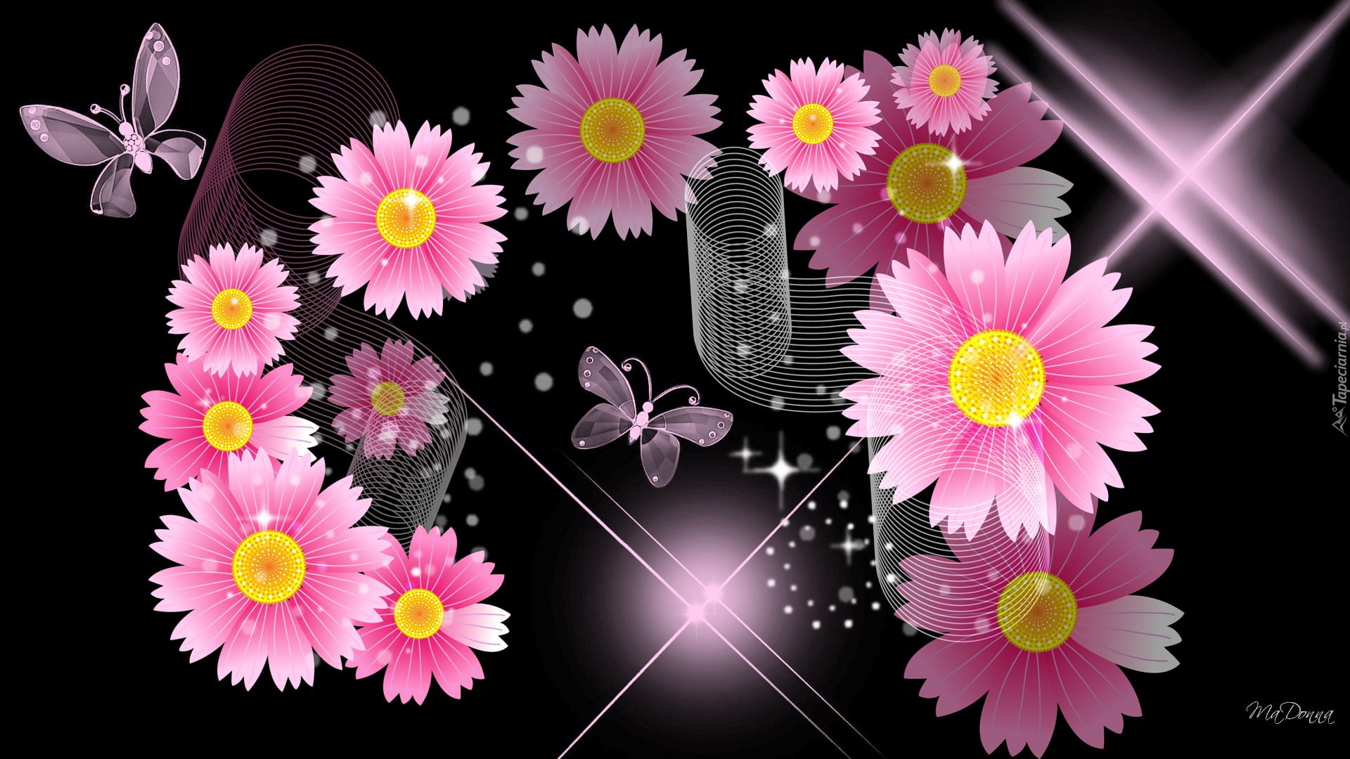 Edytor tapety: Motylki i różowe kwiatki w grafice