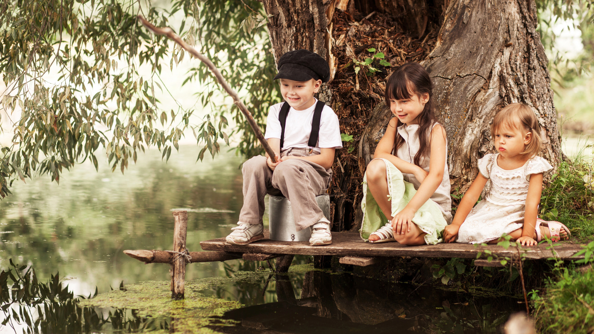 Edytor tapety: Chłopiec z wędką i dziewczynki na pomoście