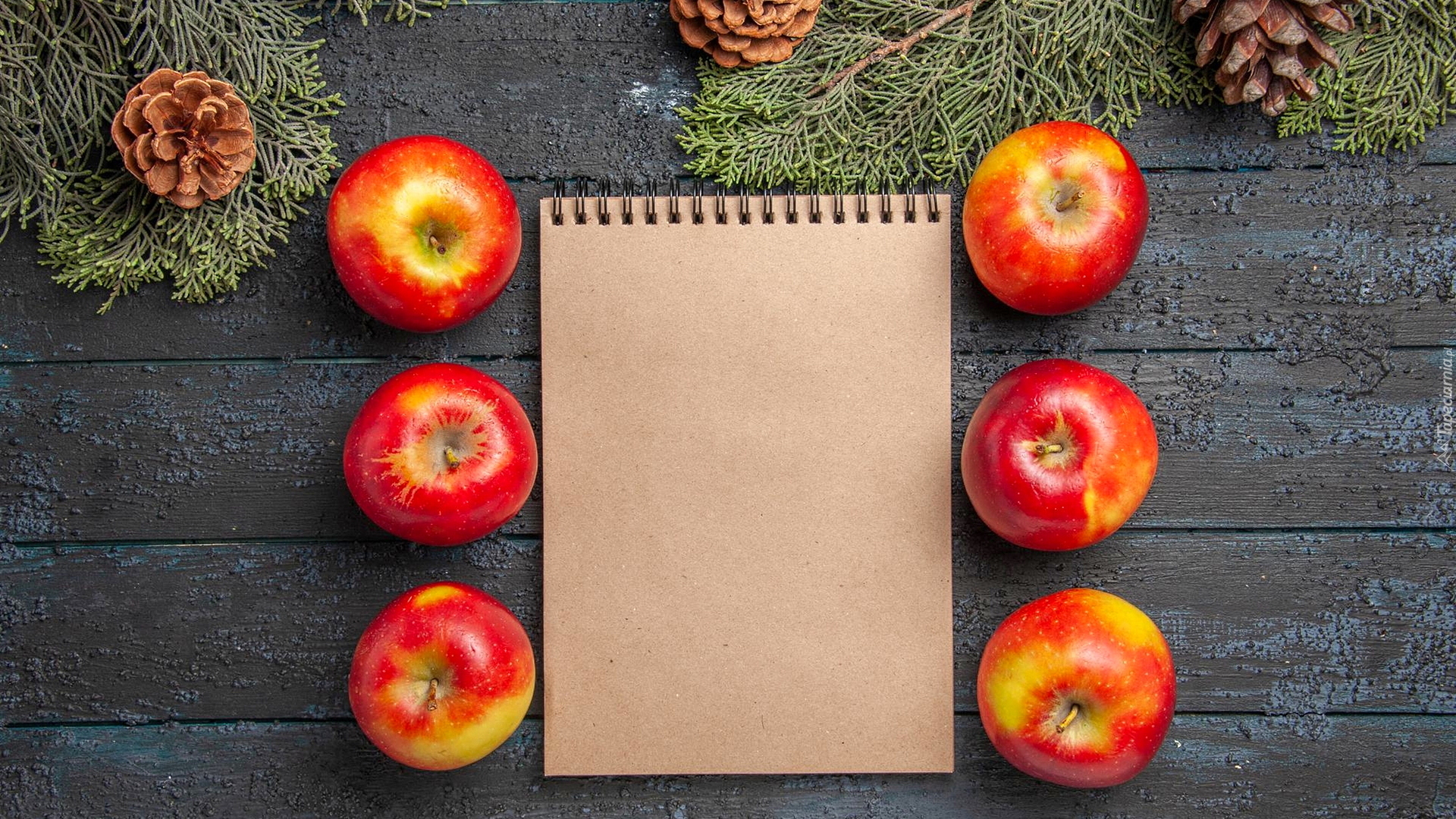 Edytor tapety: Sześć jabłek obok notesu