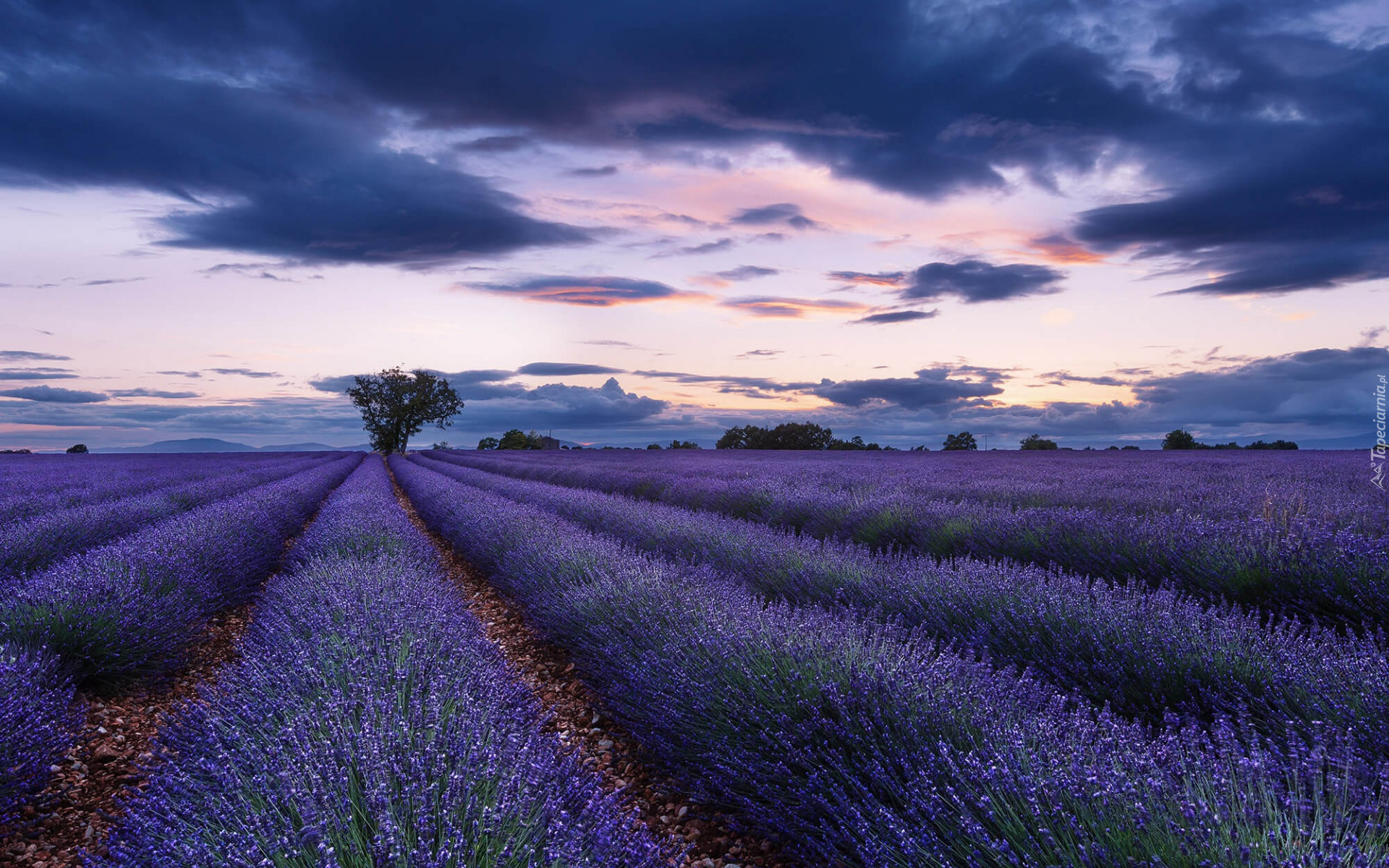 Edytor tapety: Pole lawendy i drzewa o zachodzie słońca