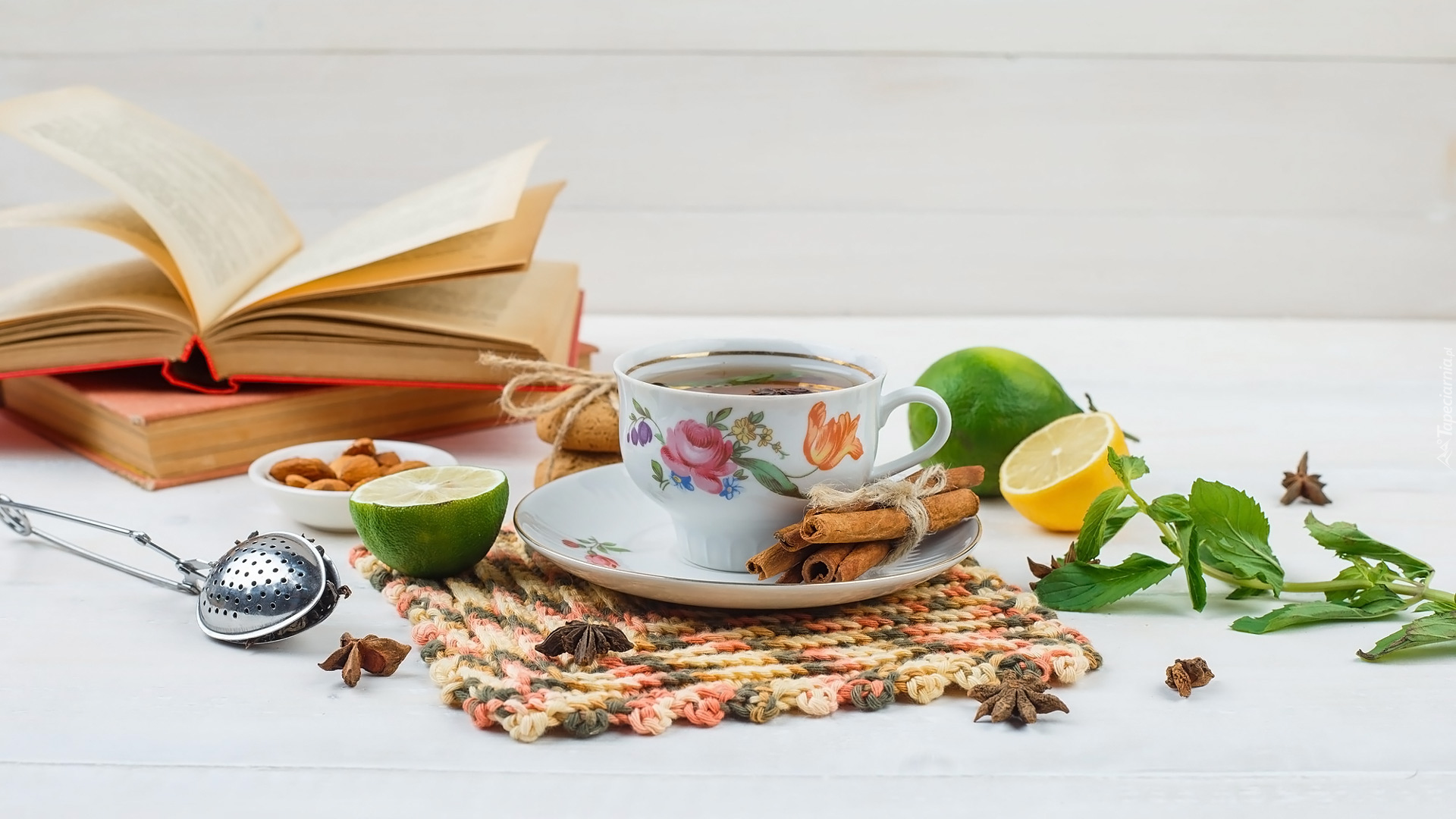 Edytor tapety: Książki i cytrusy obok filiżanki herbaty