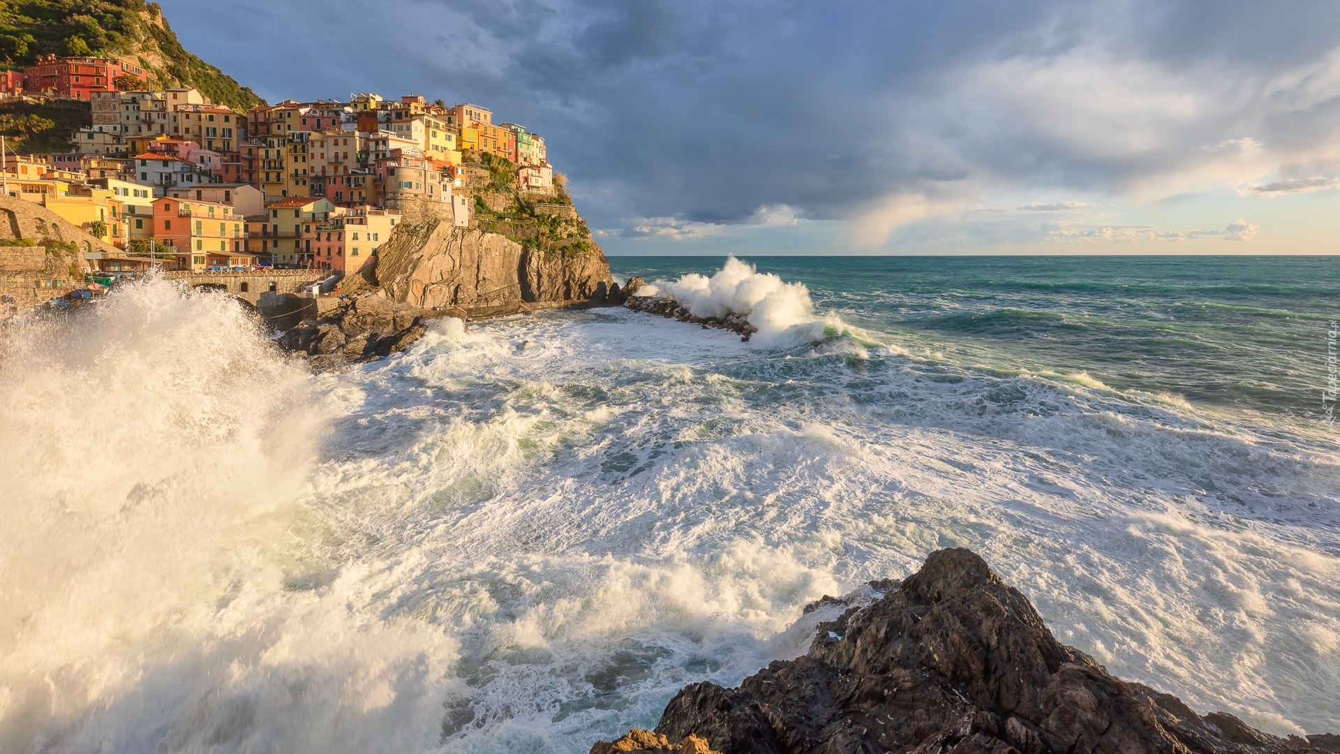 Edytor tapety: Fale w zatoczce na tle domów w Manaroli