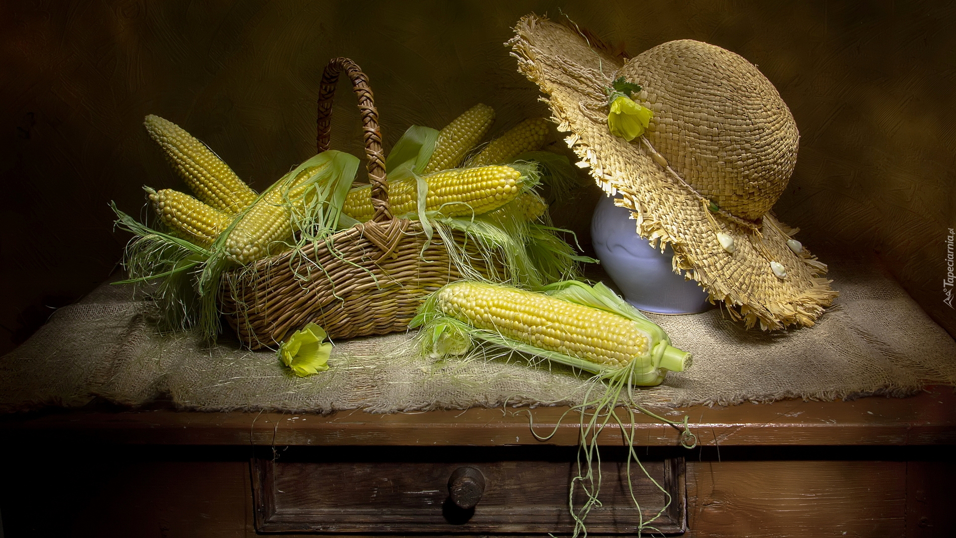 Edytor tapety: Kolby kukurydzy w koszyku obok kapelusza na dzbanku
