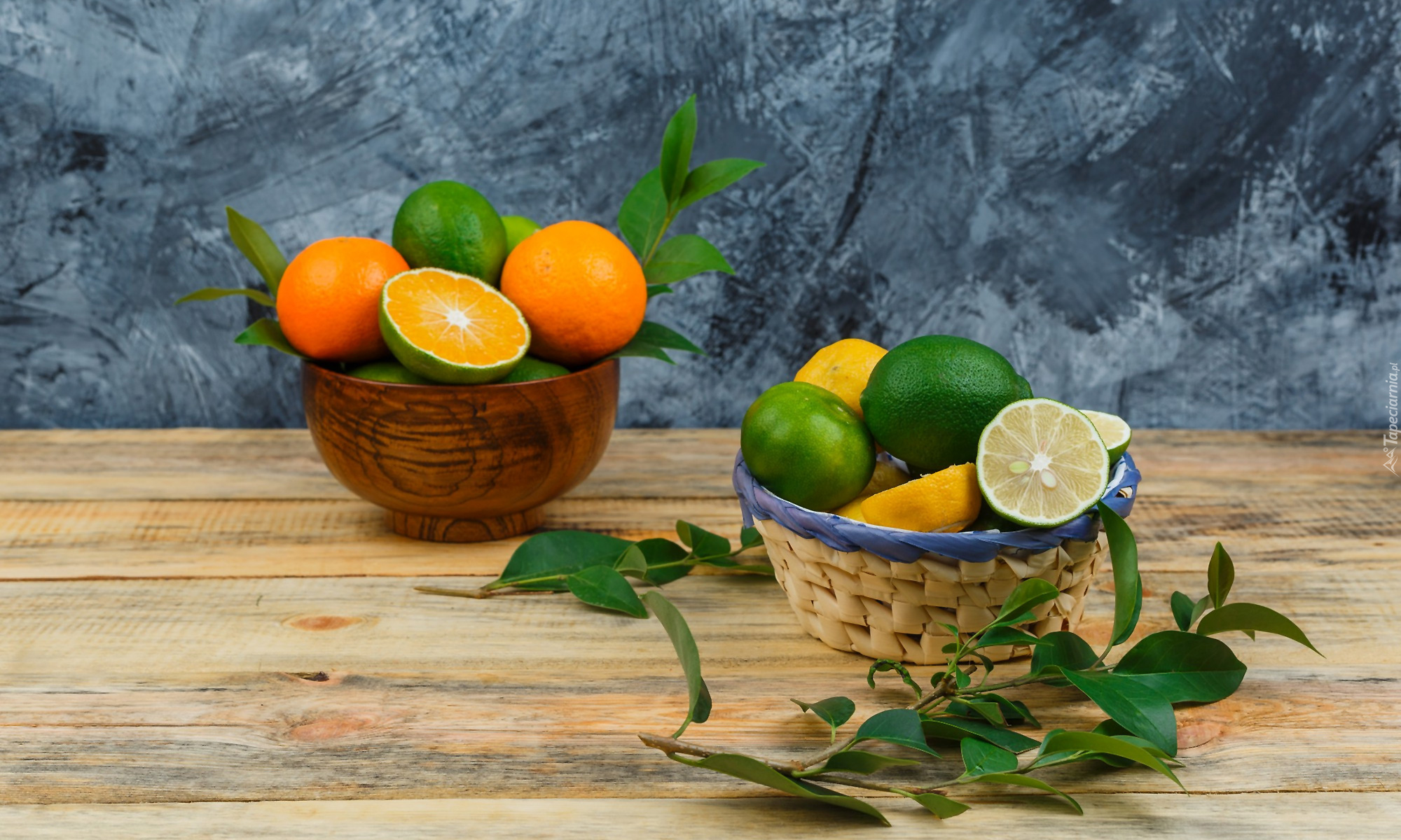 Edytor tapety: Cytrusy w koszyczku i misce