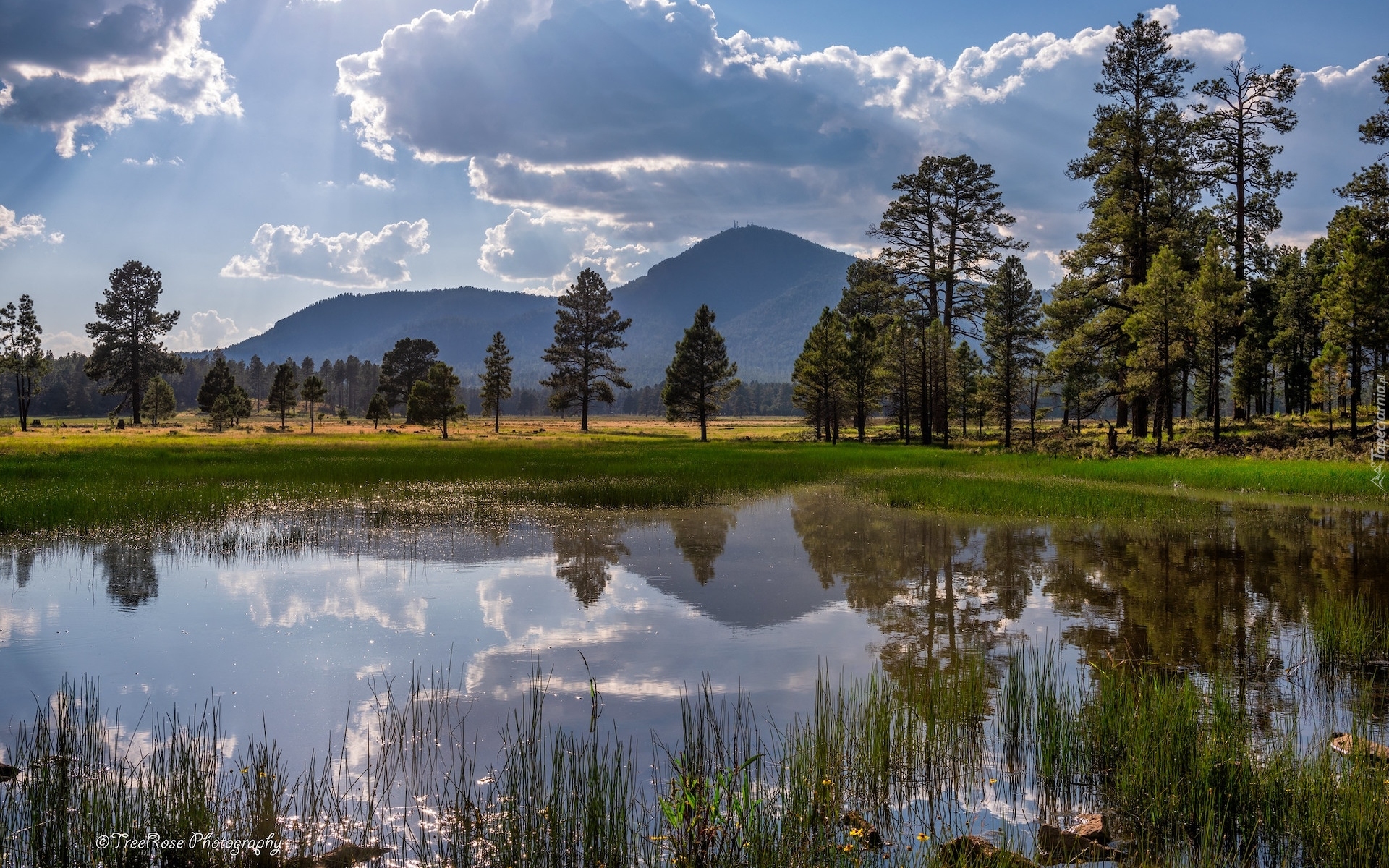 Edytor tapety: Odbicie ciemnych chmur i gór w jeziorze