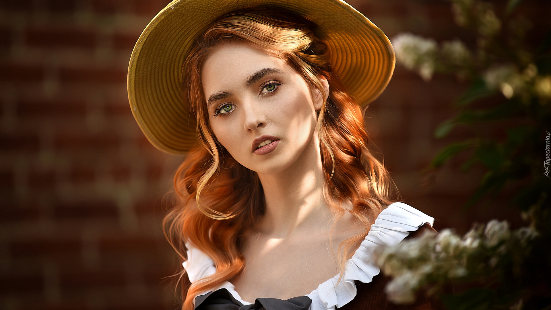 Edytor tapety: Rudowłosa kobieta z długimi włosami w kapeluszu