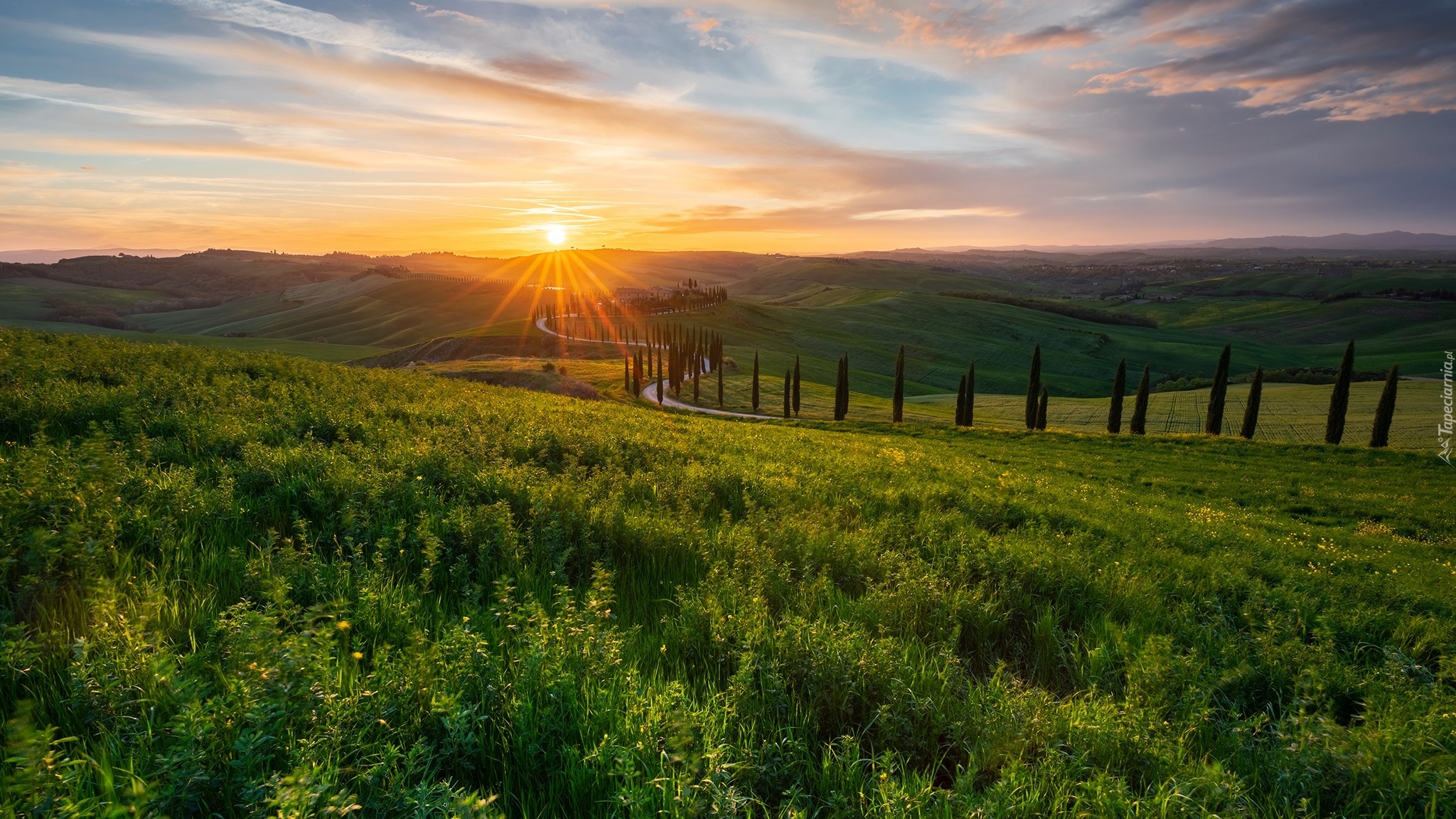 Edytor tapety: Cyprysy wzdłuż drogi w promieniach słońca