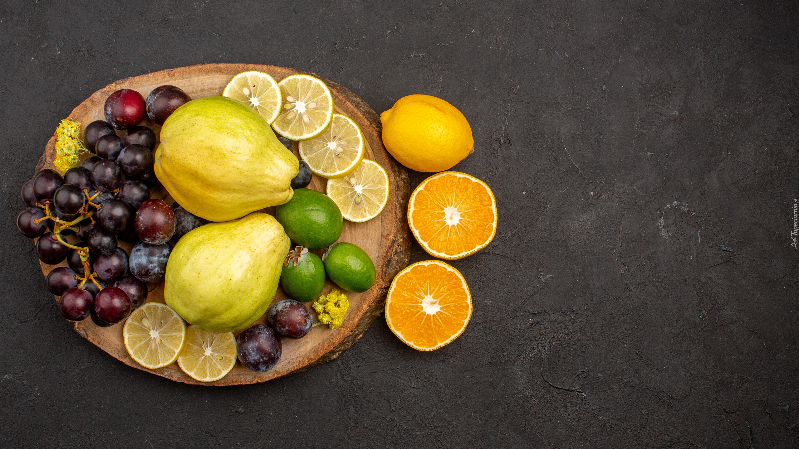 Edytor tapety: Różnorodne owoce i drewniana deska
