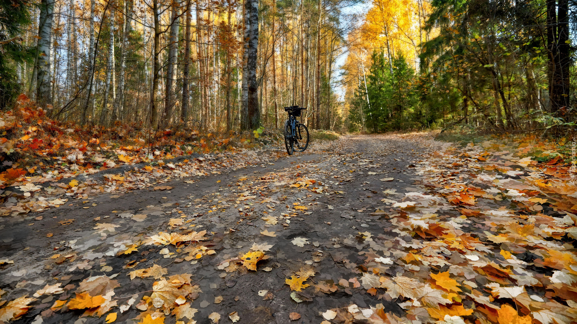 Edytor tapety: Rower i opadłe liście na leśnej drodze