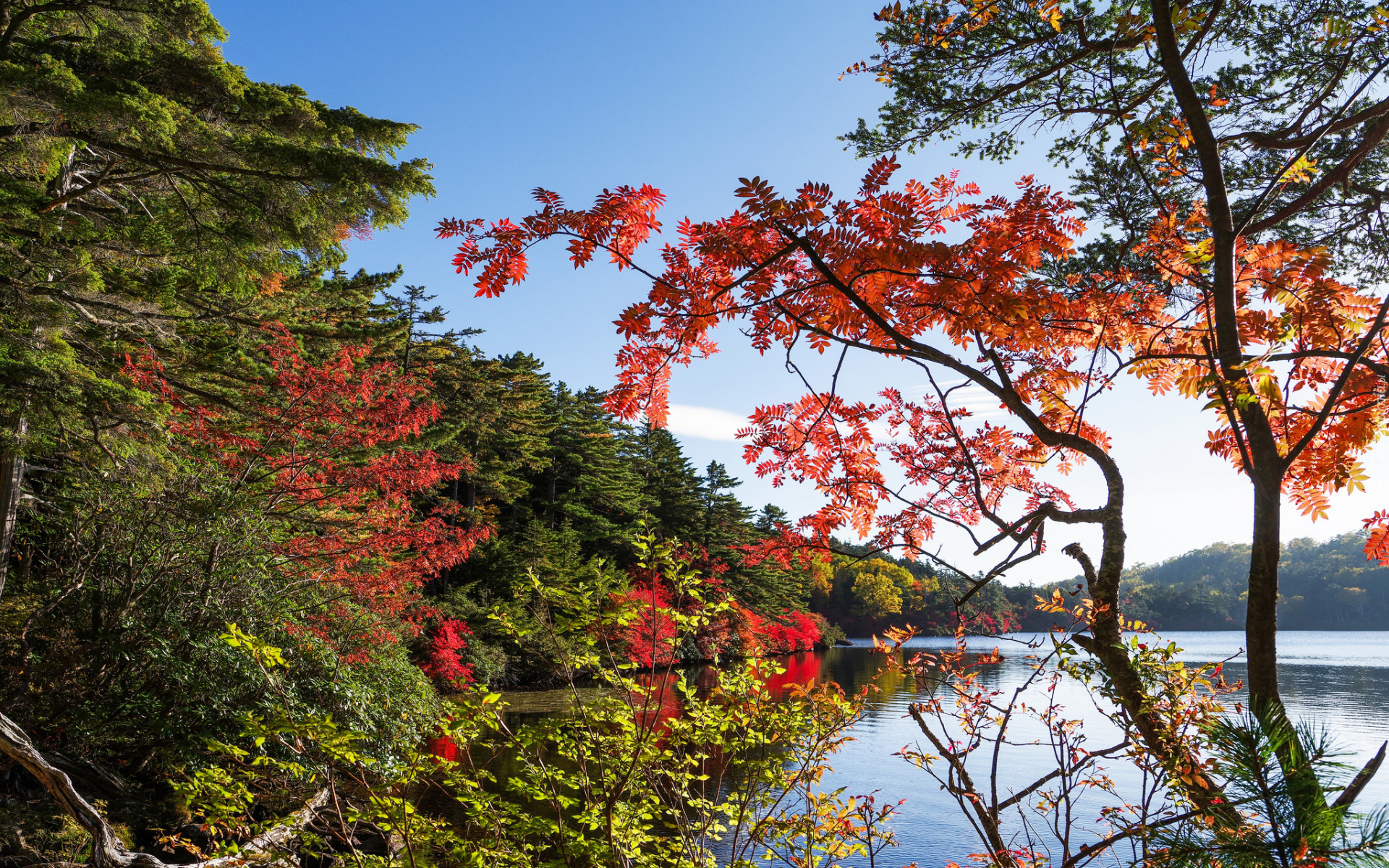 Edytor tapety: Widok zza gałęzi na jezioro