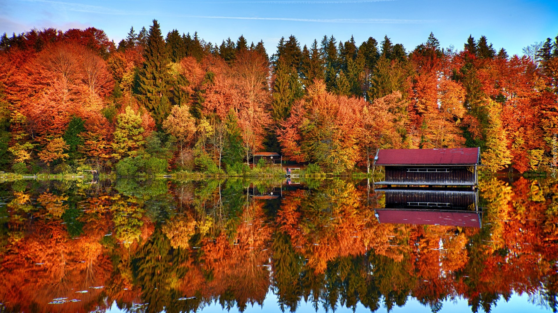Edytor tapety: Odbicie kolorowych jesiennych drzew w jeziorze