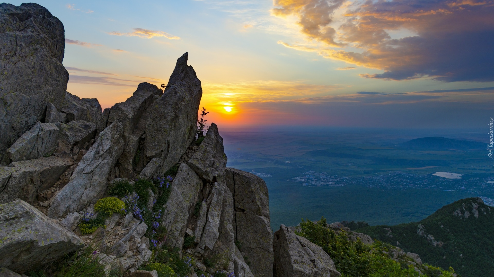 Edytor tapety: Widok ze skał na zachód słońca nad równiną