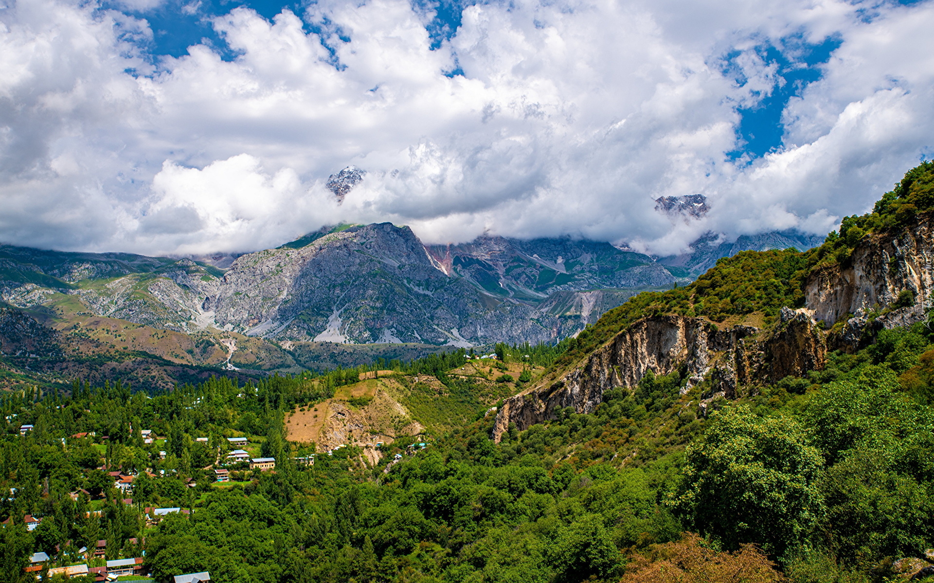 Edytor tapety: Domy i lasy w górskiej dolinie