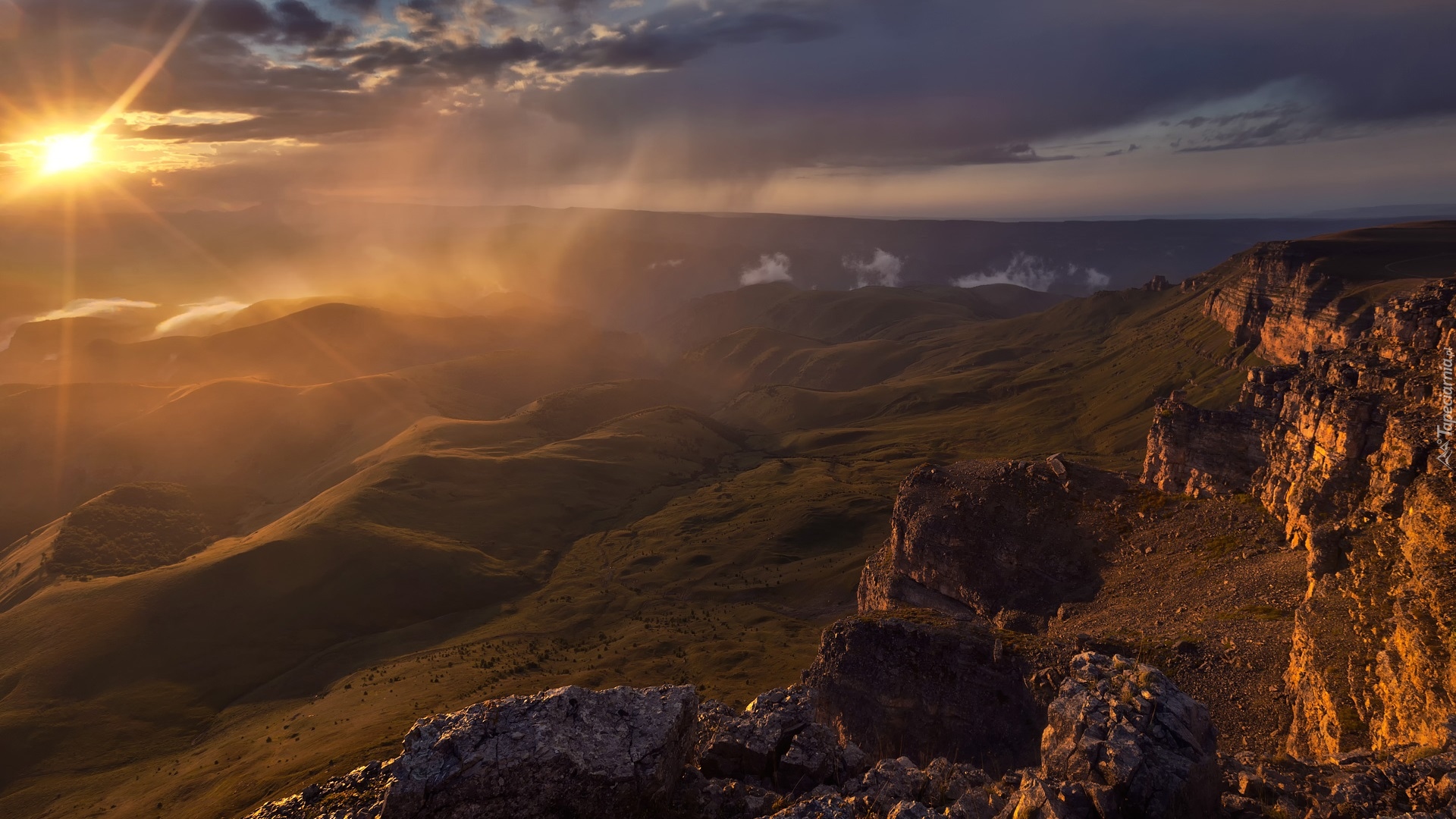 Edytor tapety: Rozświetlone zachodzącym słońcem skały i góry