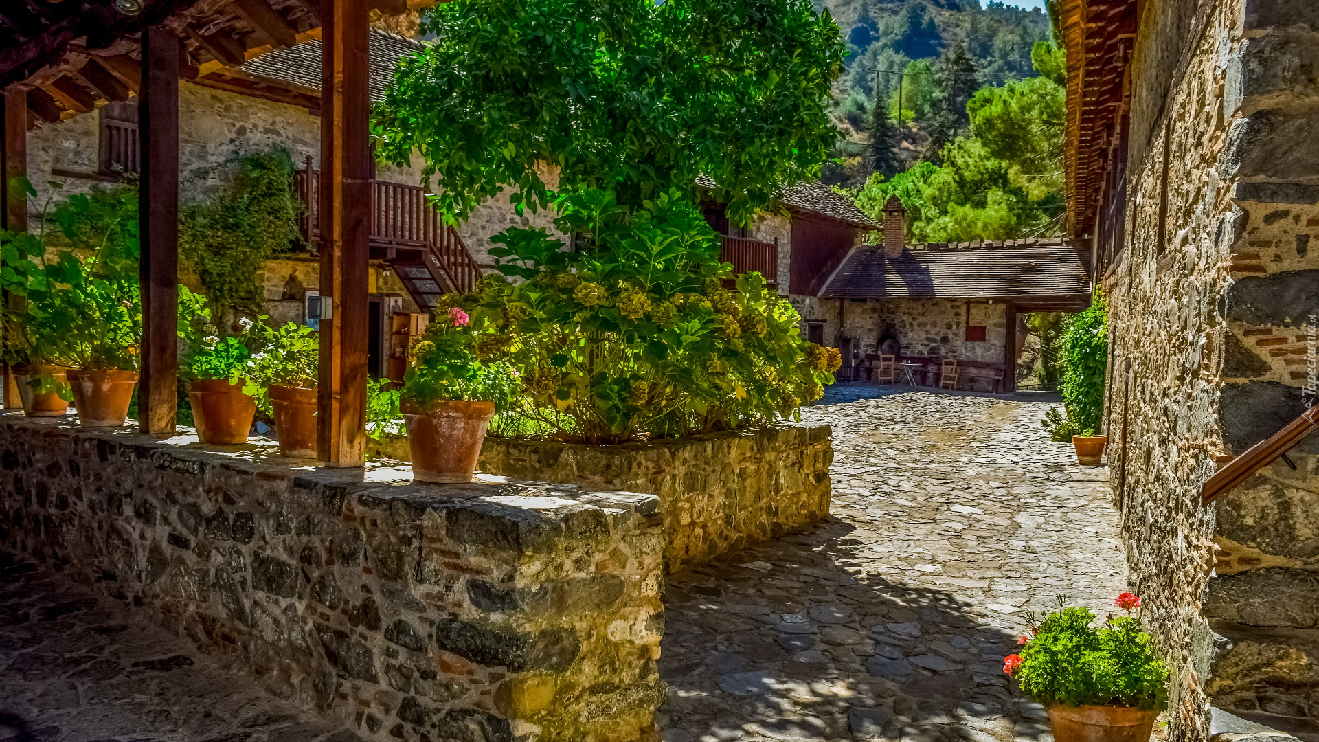 Edytor tapety: Kwiaty i drzewa na brukowanym podwórku domu