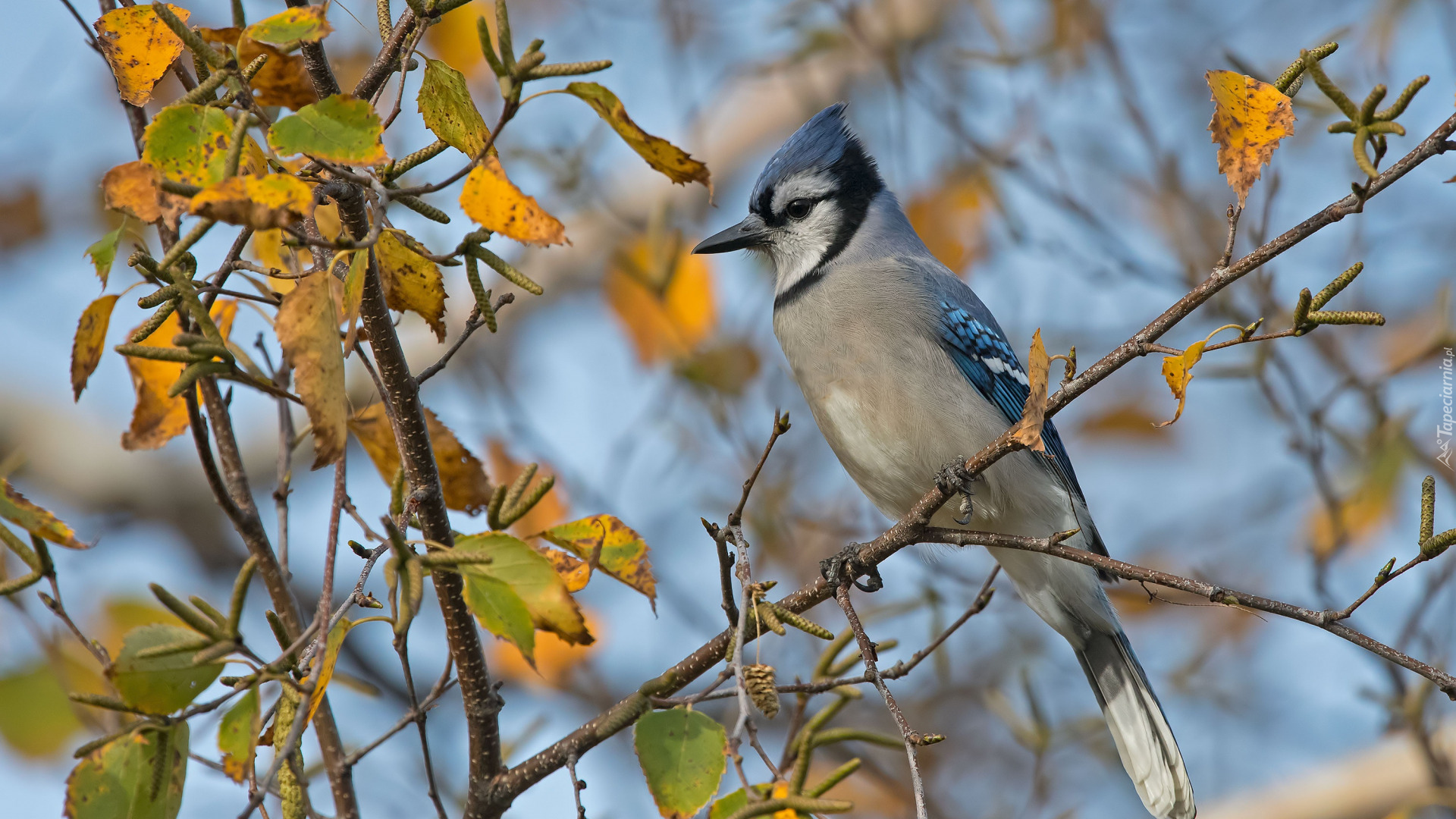 Edytor tapety: Modrosójka błękitna na gałązce z pożółkłymi liśćmi