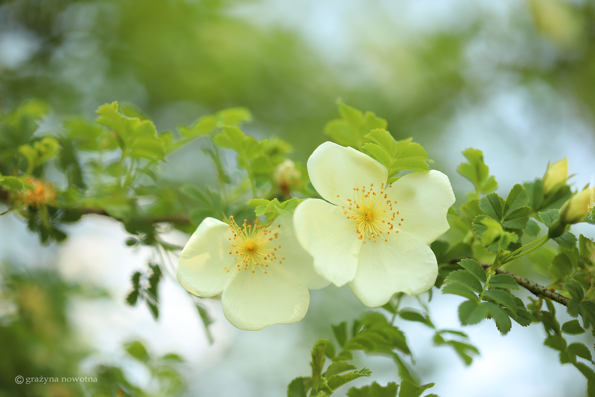 Edytor tapety: Białe kwiaty dzikiej róży na gałązce