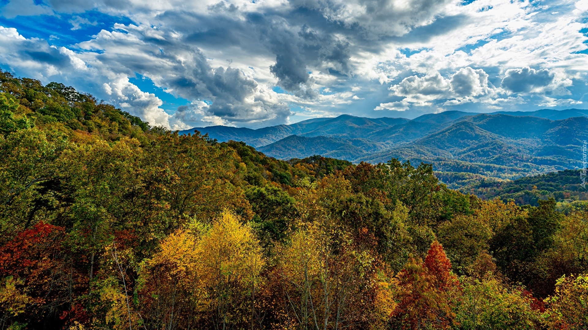 Edytor tapety: Chmury nad górami i jesiennymi drzewami