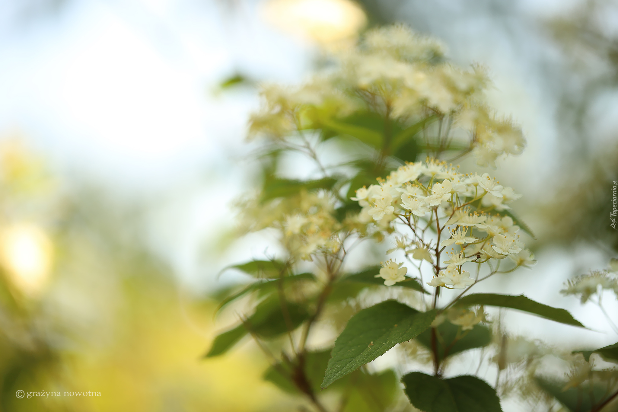 Edytor tapety: Gałązki z białymi kwiatami w rozmyciu