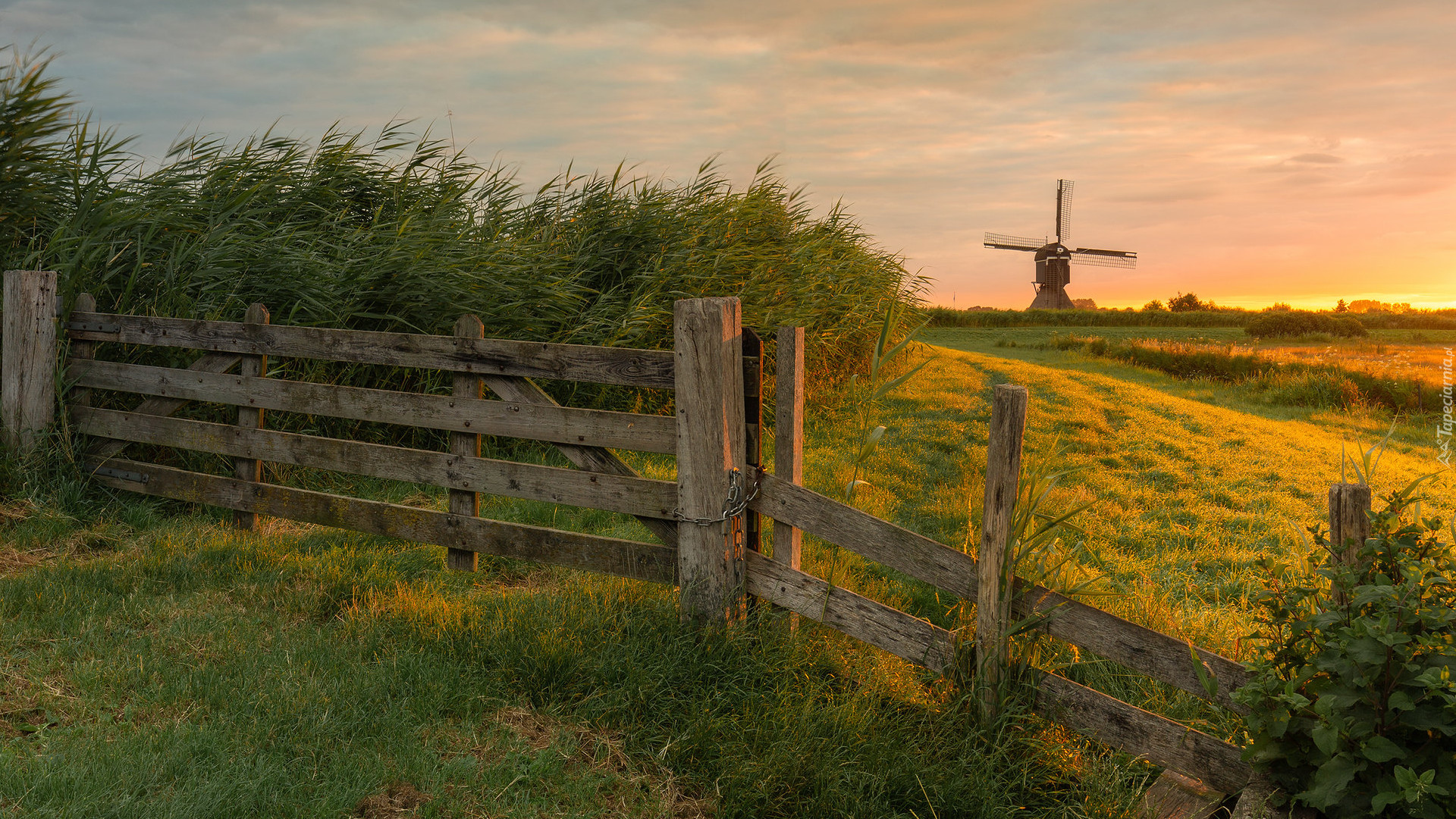 Edytor tapety: Rośliny przy ogrodzeniu i wiatrak w tle