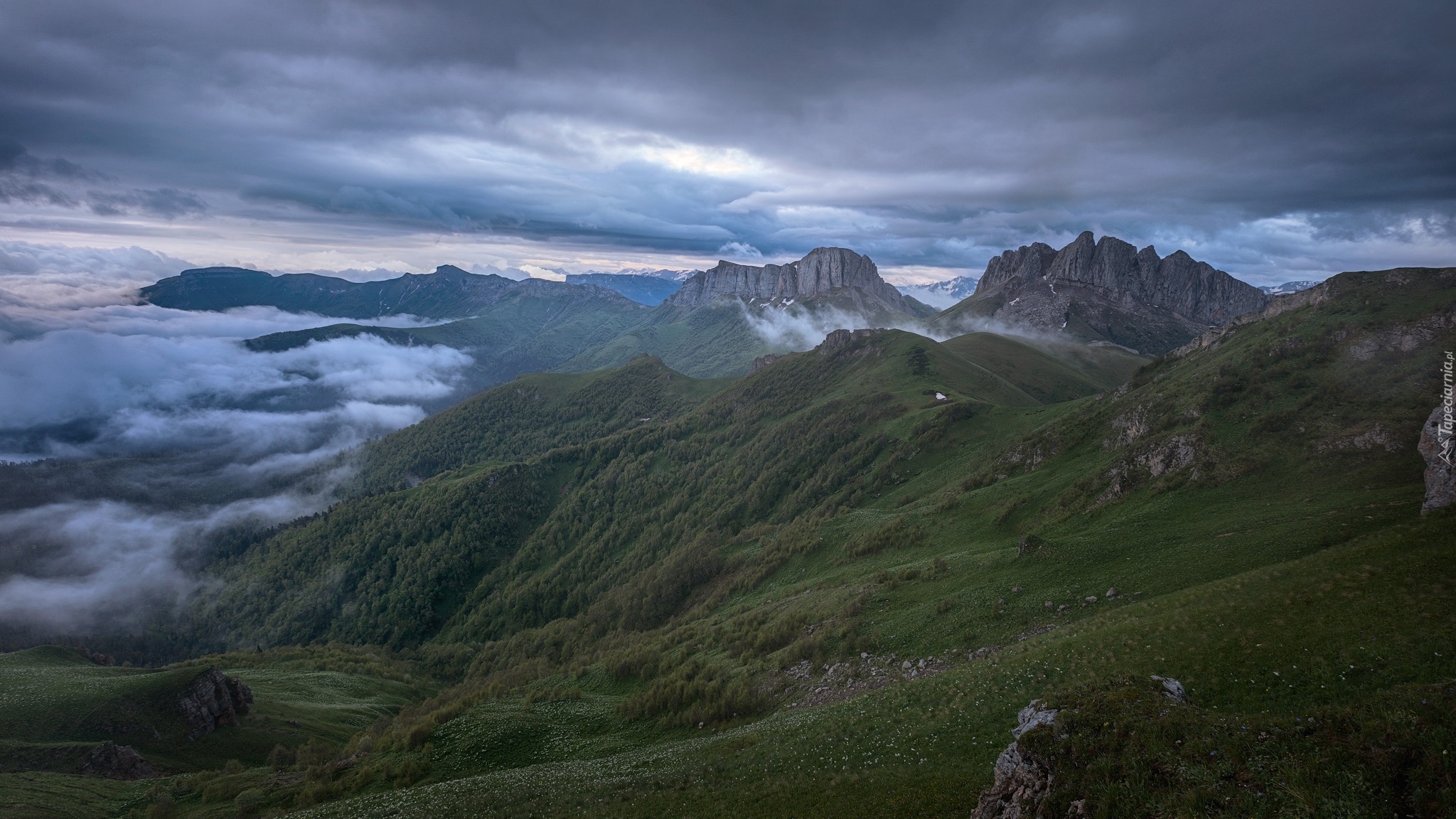 Edytor tapety: Mgła i chmury nad zalesionymi górami