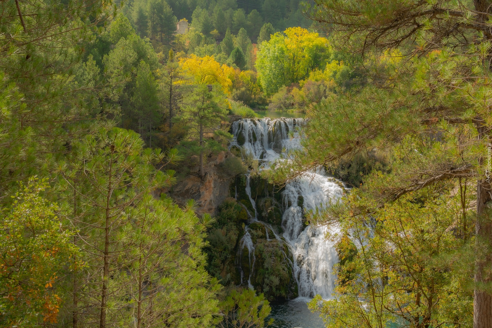Edytor tapety: Wodospad pośród zielonych drzew na skałach