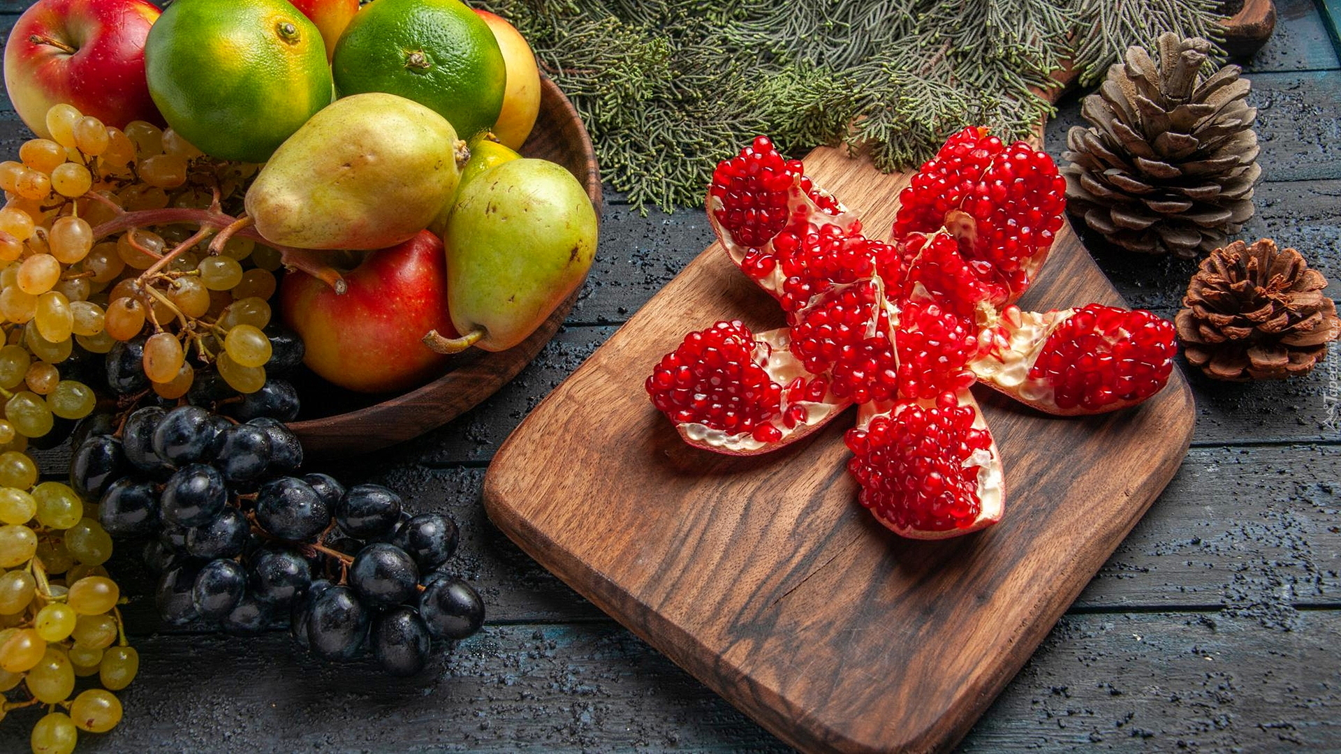 Edytor tapety: Granat na desce i owoce w misce