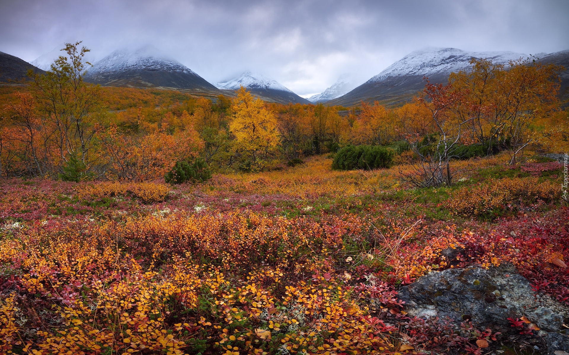 Edytor tapety: Pożółkłe rośliny na tle zamglonych gór