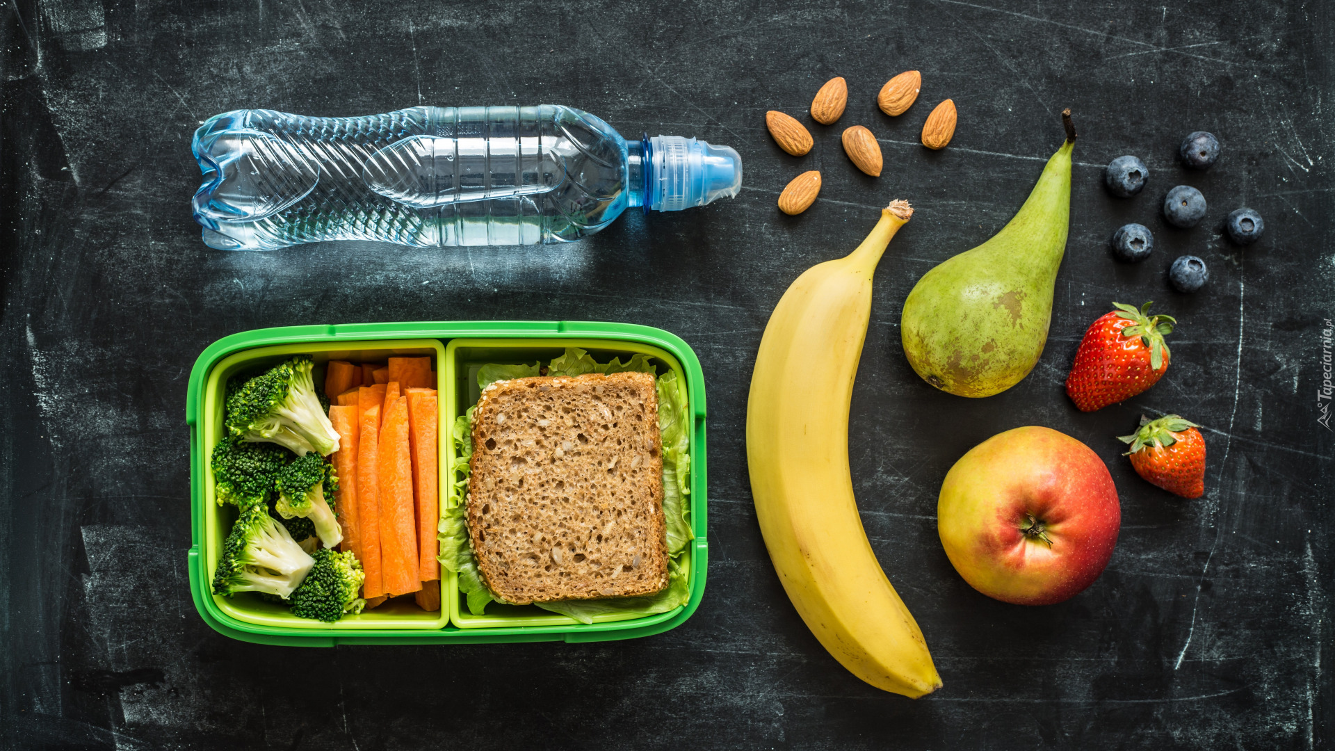 Edytor tapety: Kanapka i owoce obok butelki z wodą