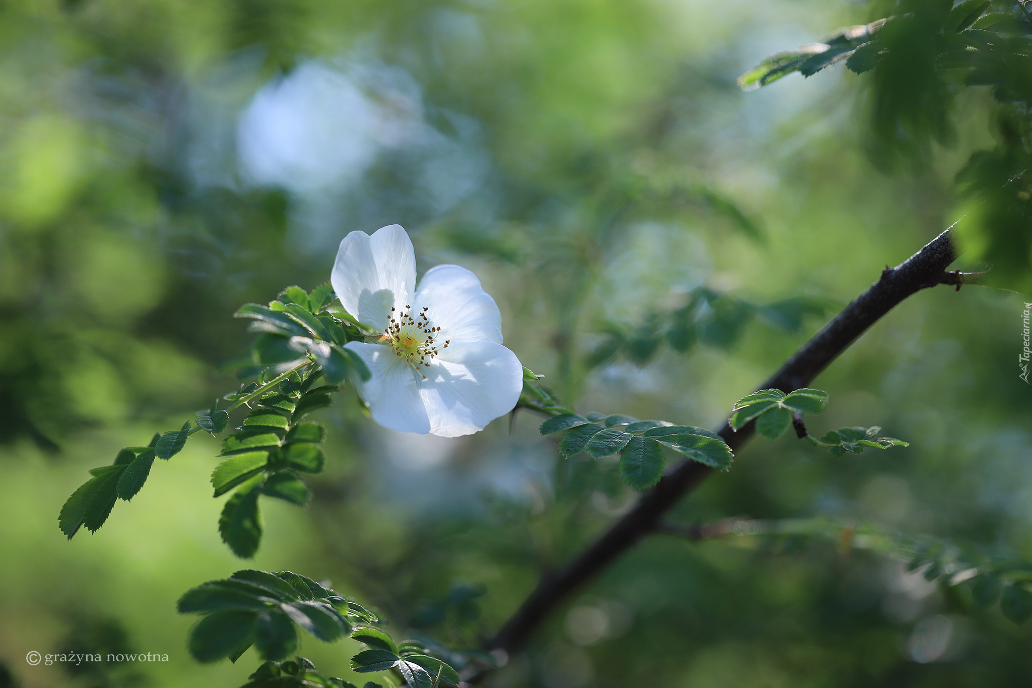 Edytor tapety: Biały kwiat dzikiej róży na gałązce